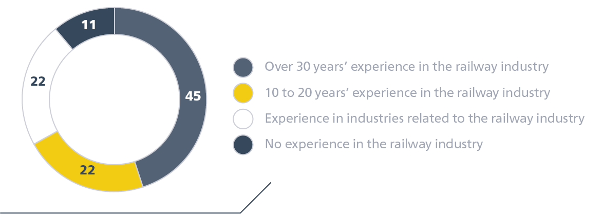 Six Directors have a track-record in the rail transport, including four Directors with over 30 years’ experience in the railway industry.