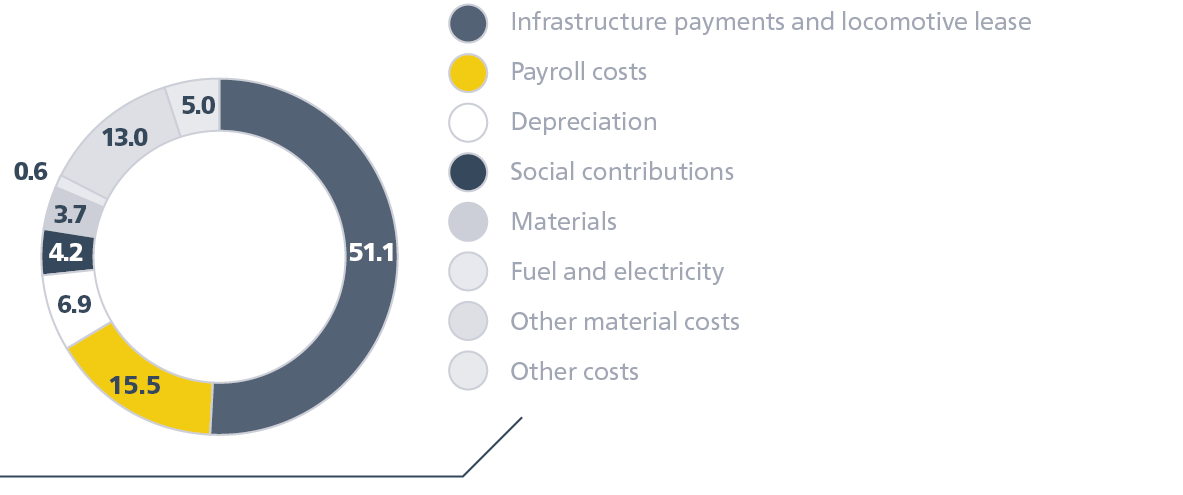 Other material costs totalled RUB 25.9 billion, demonstrating a 13.4% reduction year-on-year. Cost optimisation measures enabled the reduction of passenger carriage repair, maintenance and preparation costs.