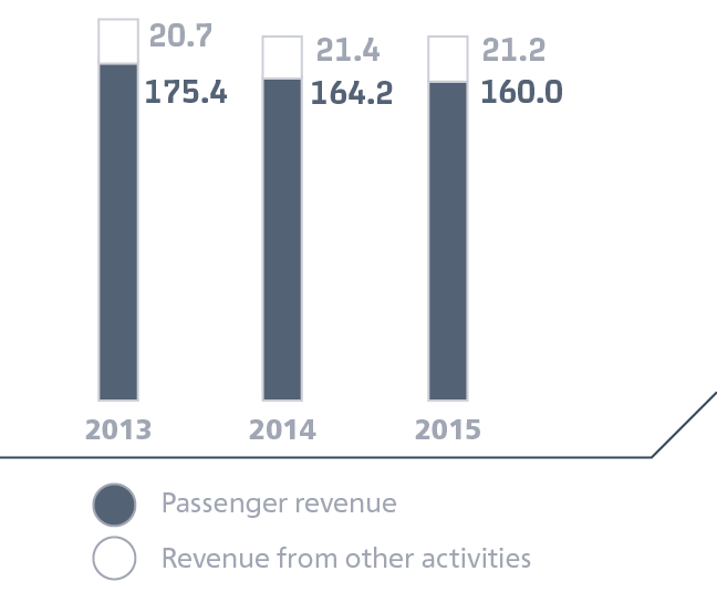 In 2015, revenue from passenger services amounted to RUB 160.0 billion, down 2.6% year-on-year.