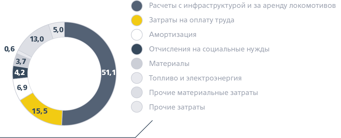 Затраты на оплату труда составили 30,8 млрд руб., или 99,1 % к уровню прошлого года. Затраты по элементу «Материалы» составили 7,5 млрд руб., или 88,1 % к уровню прошлого года. Экономия достигнута за счет оптимизации затрат и сокращения расходов на проведение ремонта и обслуживания подвижного состава, вовлечения в производство материалов повторного использования.