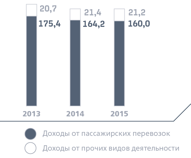 Доходы от перевозки пассажиров за 2015 год составили 160,0 млрд руб., что на 2,6 % ниже уровня 2014 года.