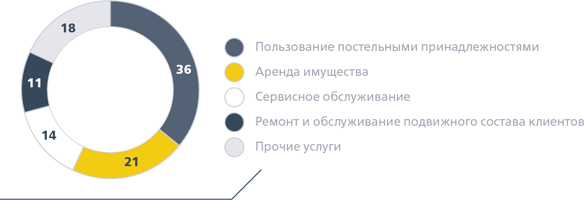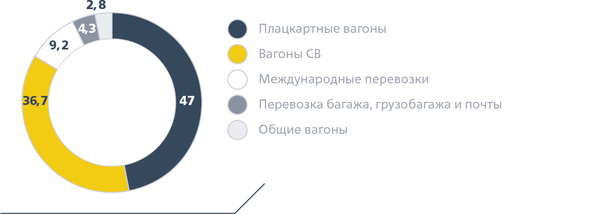 Доходы от перевозки пассажиров в плацкартных и общих вагонах составили 79,2 млрд руб. Увеличение на 3,1 % к прошлому году обусловлено индексацией тарифа на 10 % при сокращении пассажирооборота в данном сегменте на 3,3 %.